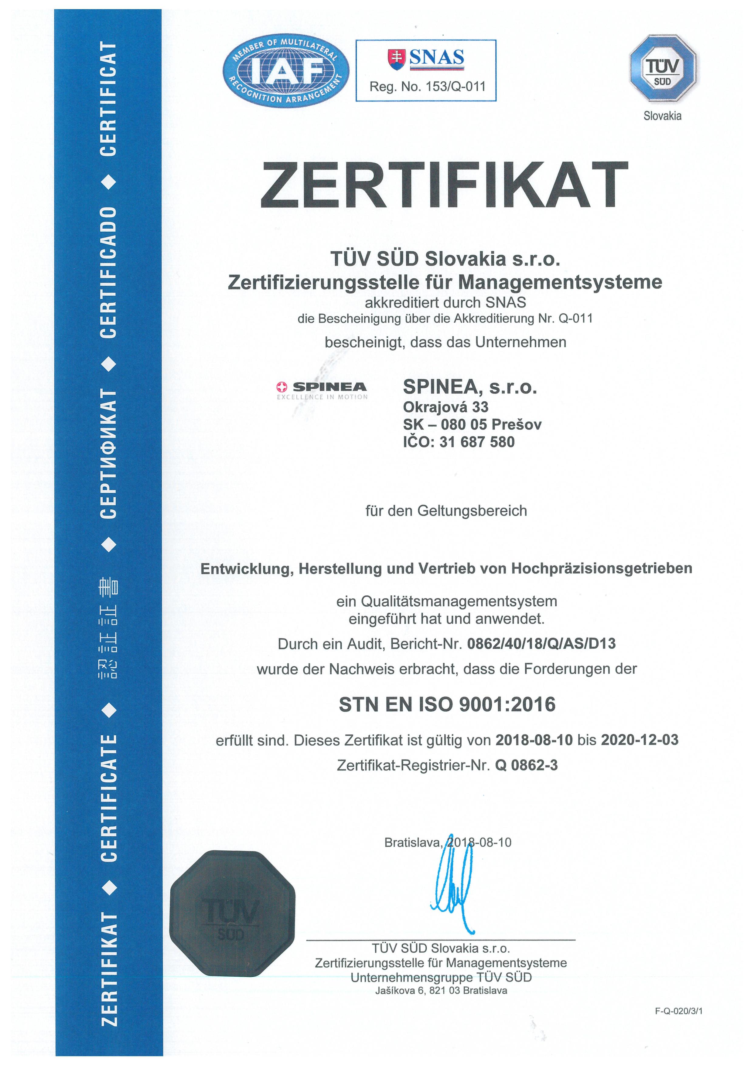 2002年11月,SPINEA根据EN ISC 9001:2000通过了重新认证程序,并获得了ISO 9001:2000证书,并在2011年获得了重新认证后的ISO 9001:2009证书。 该国际标准帮助提高公司管理,如在准备,实施,提高质量管理效率,根据客户收集的需求提高客户满意度等方面。质量管理系统检查SPINEA工厂的所有生产细节,从文档、研究计划到最终产品的最终检验。 不仅从SPINEA公司的高科技产品,而且ISO证书也可以证明,SPINEA是国际市场上的重要合作伙伴。